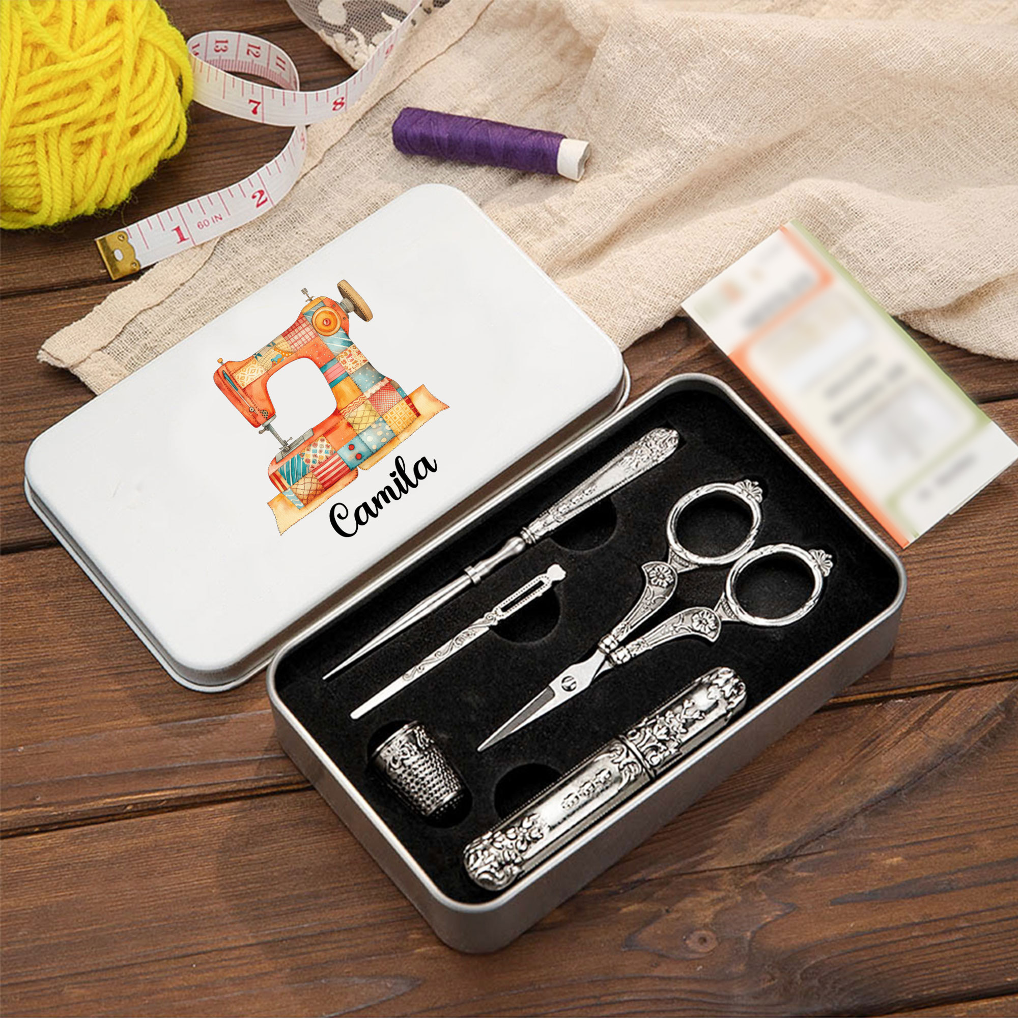 Personalized Name Patchwork Sewing Machine Design 6PCS Vintage Sewing Tools Set with Tin Box, Birthday/Mother's Day Gift for Mom/Tailors/Sewing Lovers